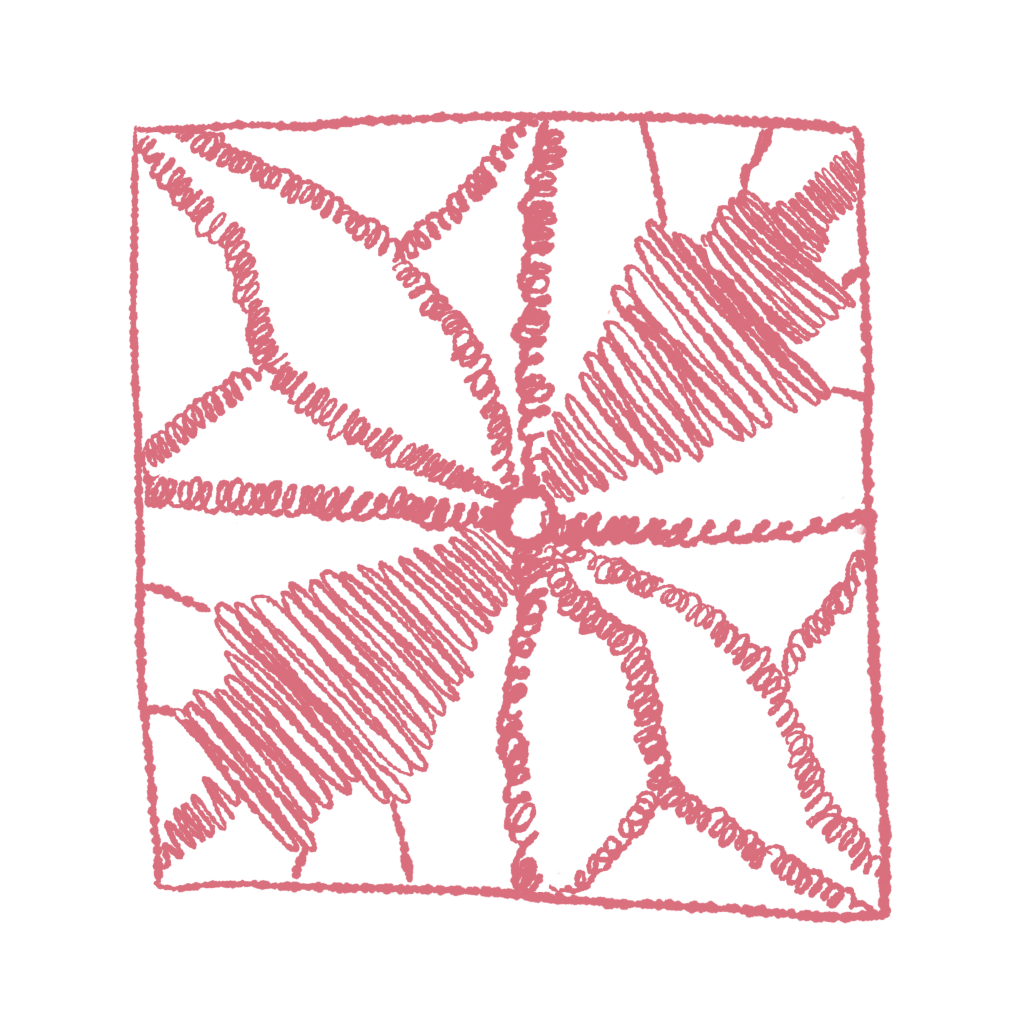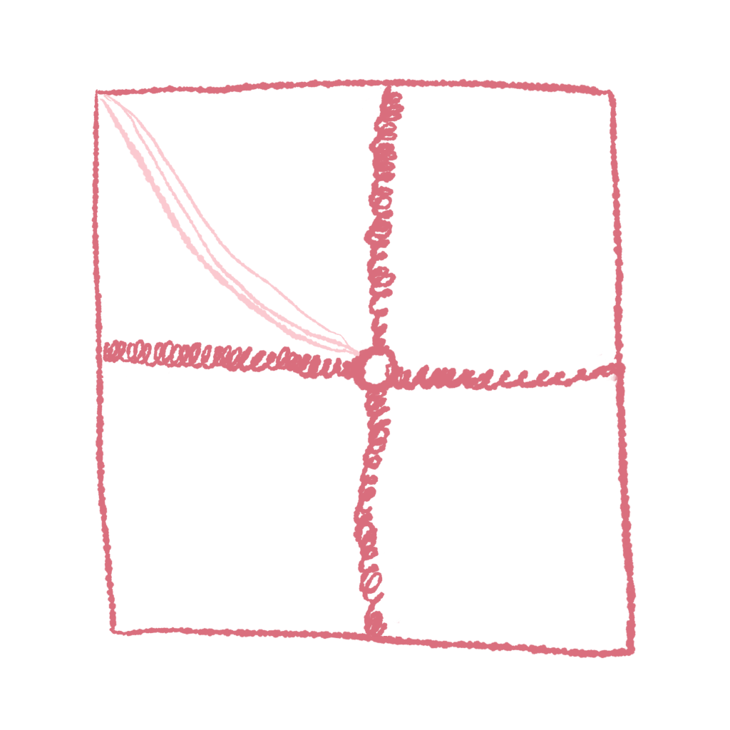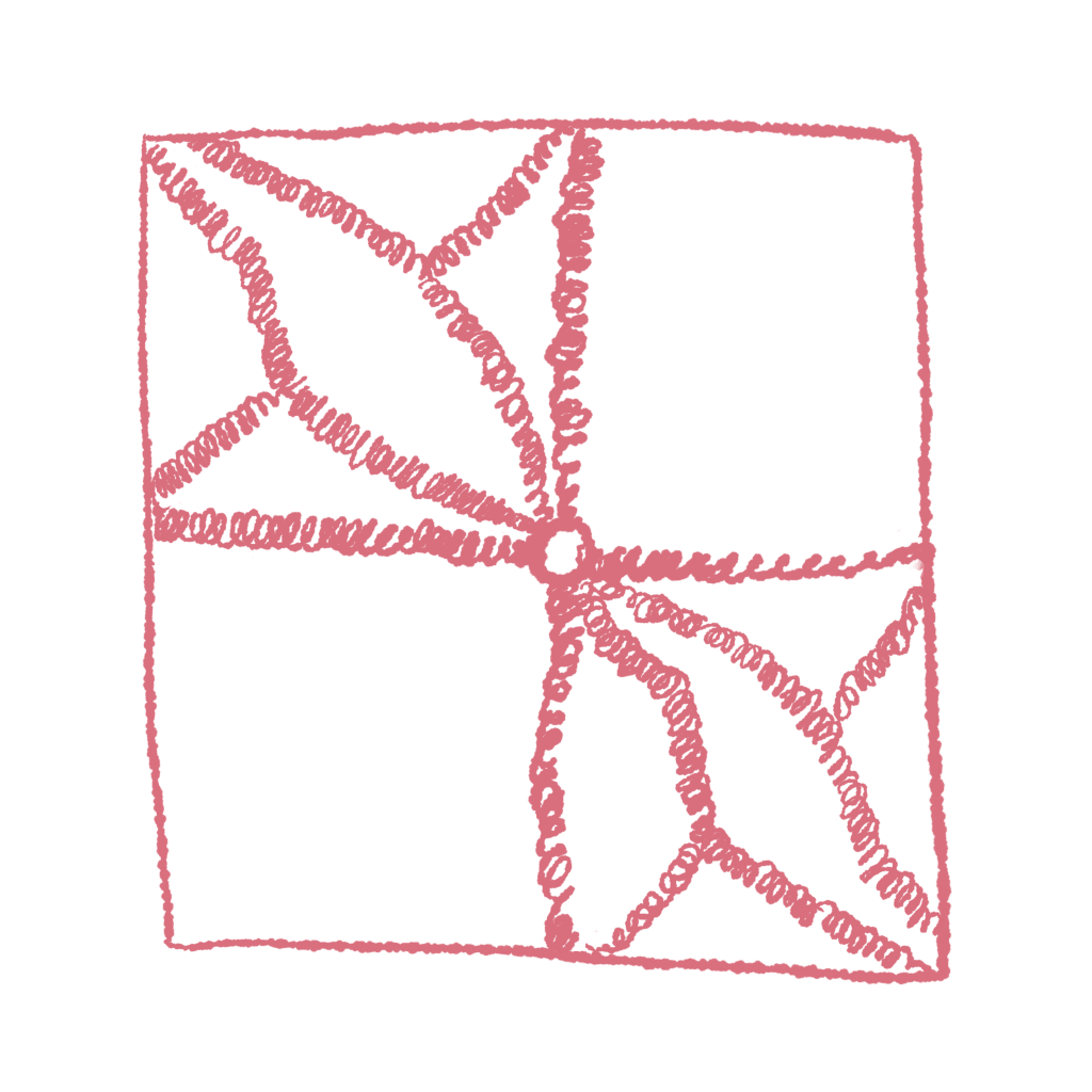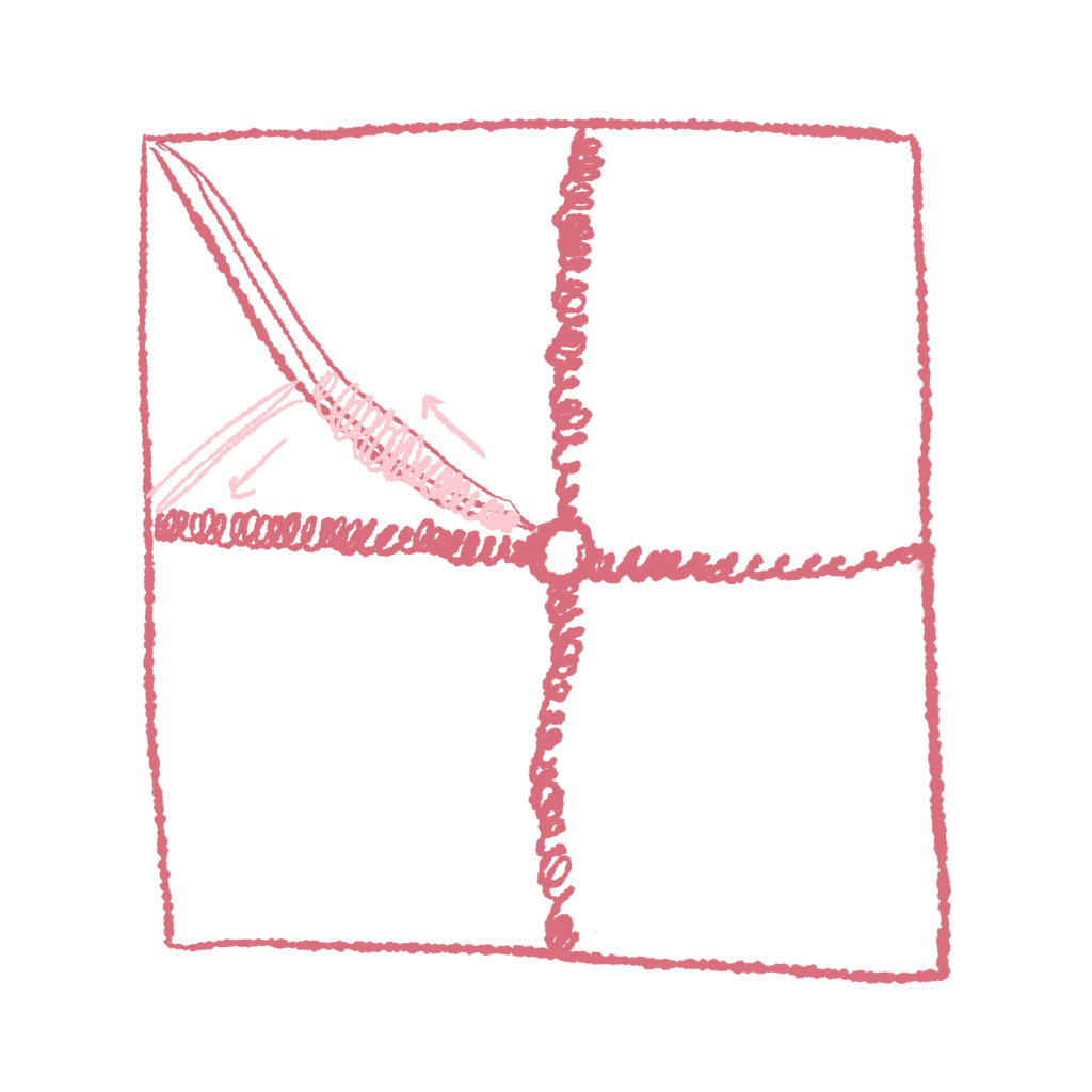 Create another buttonholed arc in the top-left square. Repeat the same process to make an identical motif in the bottom-right square.