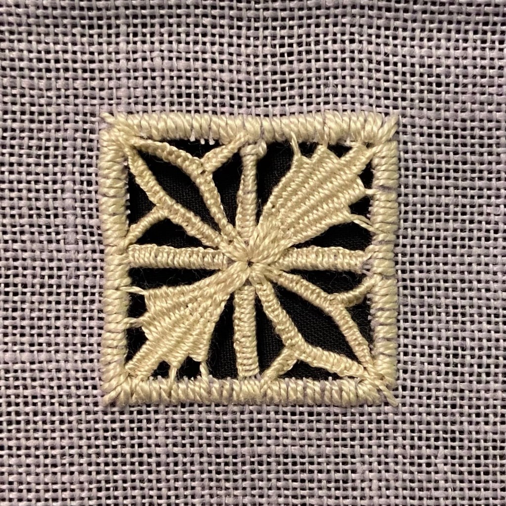 Here is my completed motif. I used 28 count linen with no. 8 pearl cotton for the satin stitch border and no. 12 pearl cotton for the lace elements. The fabric in the original image is much finer, but this is what I had on hand.
