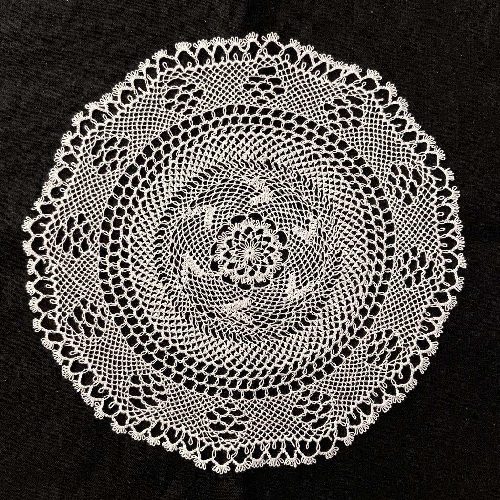 I have no idea how long I spent on this one, but I know it was at least tens of hours. I started it in October 2022 and it saw several airports as I took it with me on work travel. My cousin has laid claim to it after the state fair, which is fitting as she helped me get into lace making in the first place by gifting me a copy of the Priscilla Armenian Lace Book after our grandmother died.