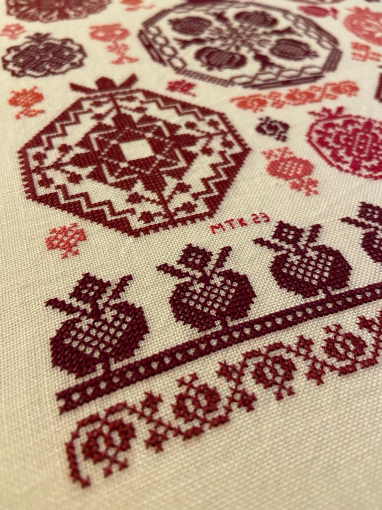 Pomegranate Quaker by Owl Forest Embroidery was almost two years in the making. I worked on it almost exclusively while traveling – on planes, in hotel rooms, and when I was otherwise away from home. Finishing it was bittersweet because it brought me a great deal of comfort to have something familiar to work on in times when I was under a lot of stress.