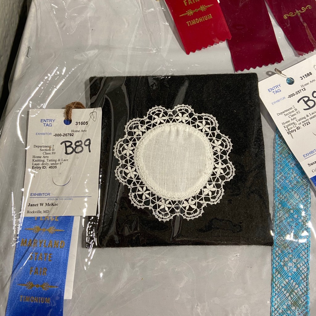 The eagle-eyed may notice that my doily is surrounded by tatted pieces. There was a mix up and I accidentally registered for tatting instead of bobbin/needle lace. I was surprised they didn’t move my entry but it worked out in the end.