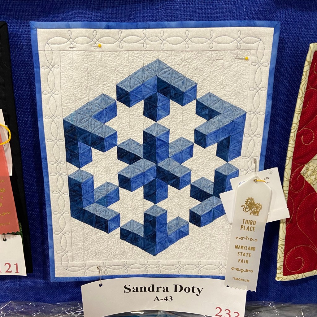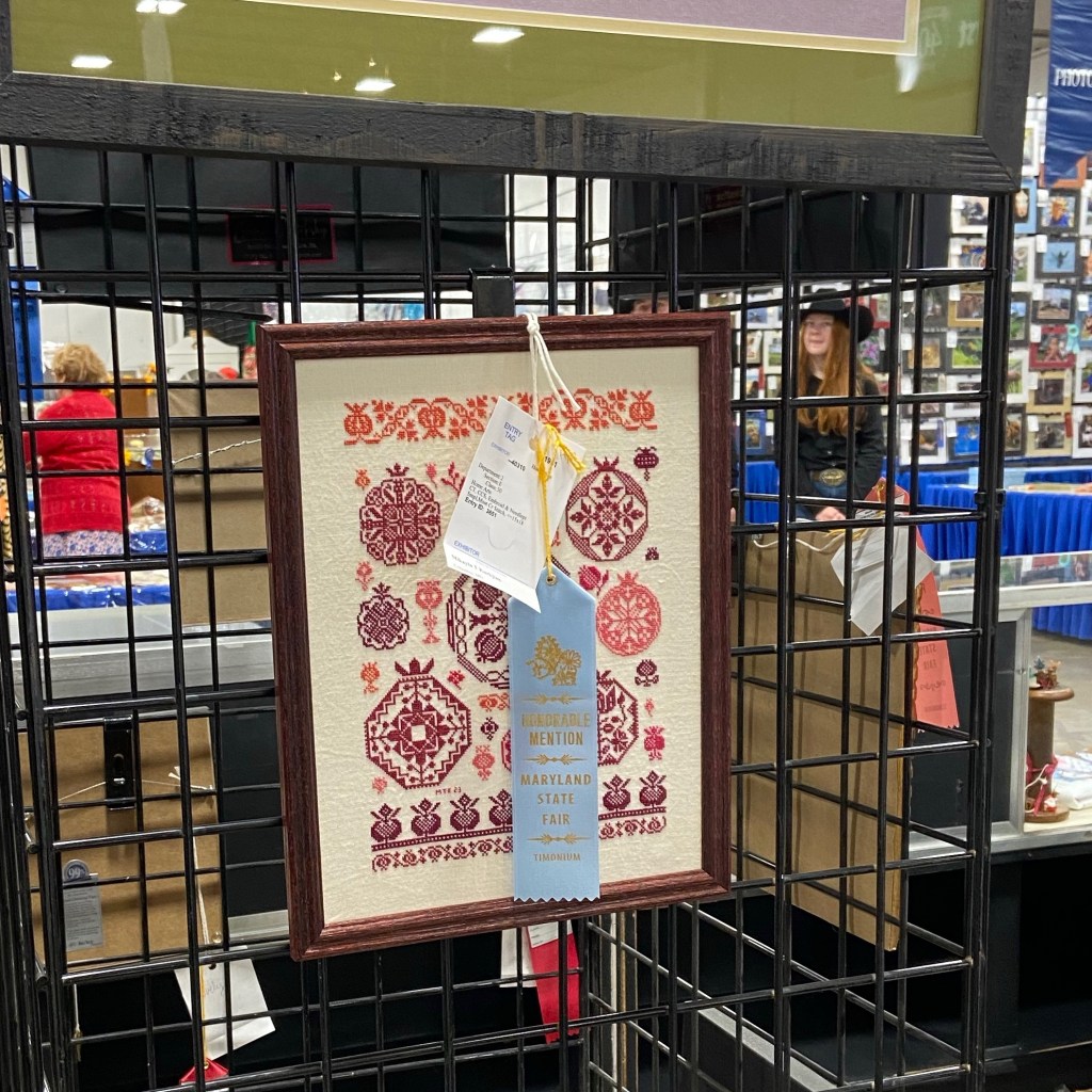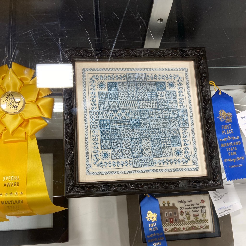 I didn’t get many pictures of cross stitch entries because it was hard to get close enough to see them properly. It’s fun to recognize charts in the wild though. Modern Folk Embroidery seems to be very popular in Maryland. This blackwork piece caught my eye – it’s a very well-deserved first place.