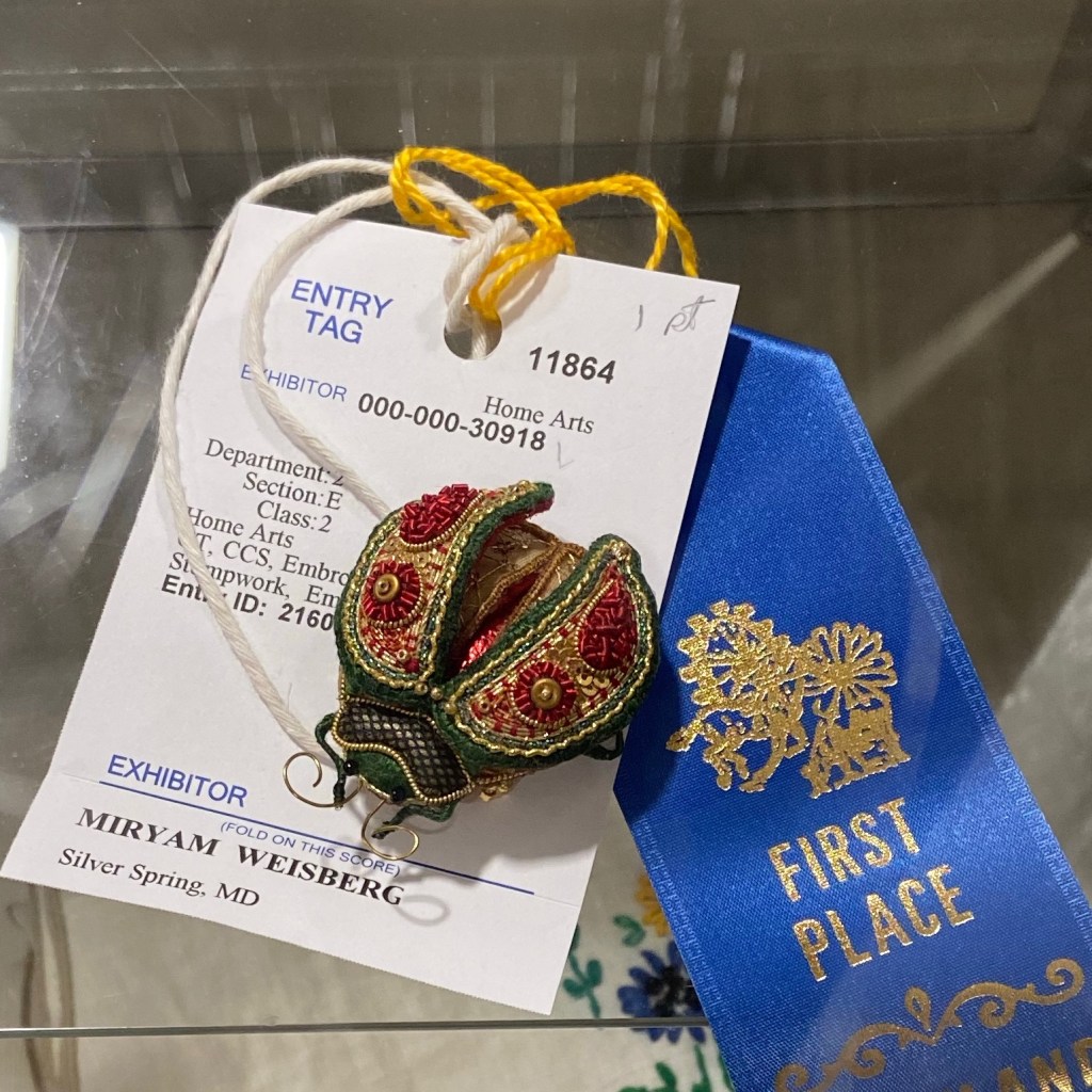 There were so many beautiful lace entries this year. Another CRLG ribbon went to a stunning bobbin lace flower with metallic threads. It’s inspiring me to make use of more color in my own lace. Below it is a floral piece made with extremely fine thread. I certainly don’t need another hobby, but seeing this bobbin lace tempts me.