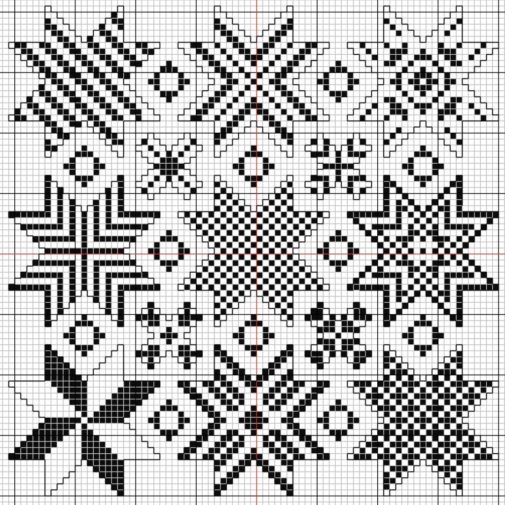 Each box in the chart represents 4 threads. The filling stitches in the stars would most likely be dove’s eyes or picots. I think it would be fun to find a different filling stitch for each of the small square blocks. These could be taken as large 12 thread squares or a grid of 4 thread squares, which presents an interesting design opportunity.
