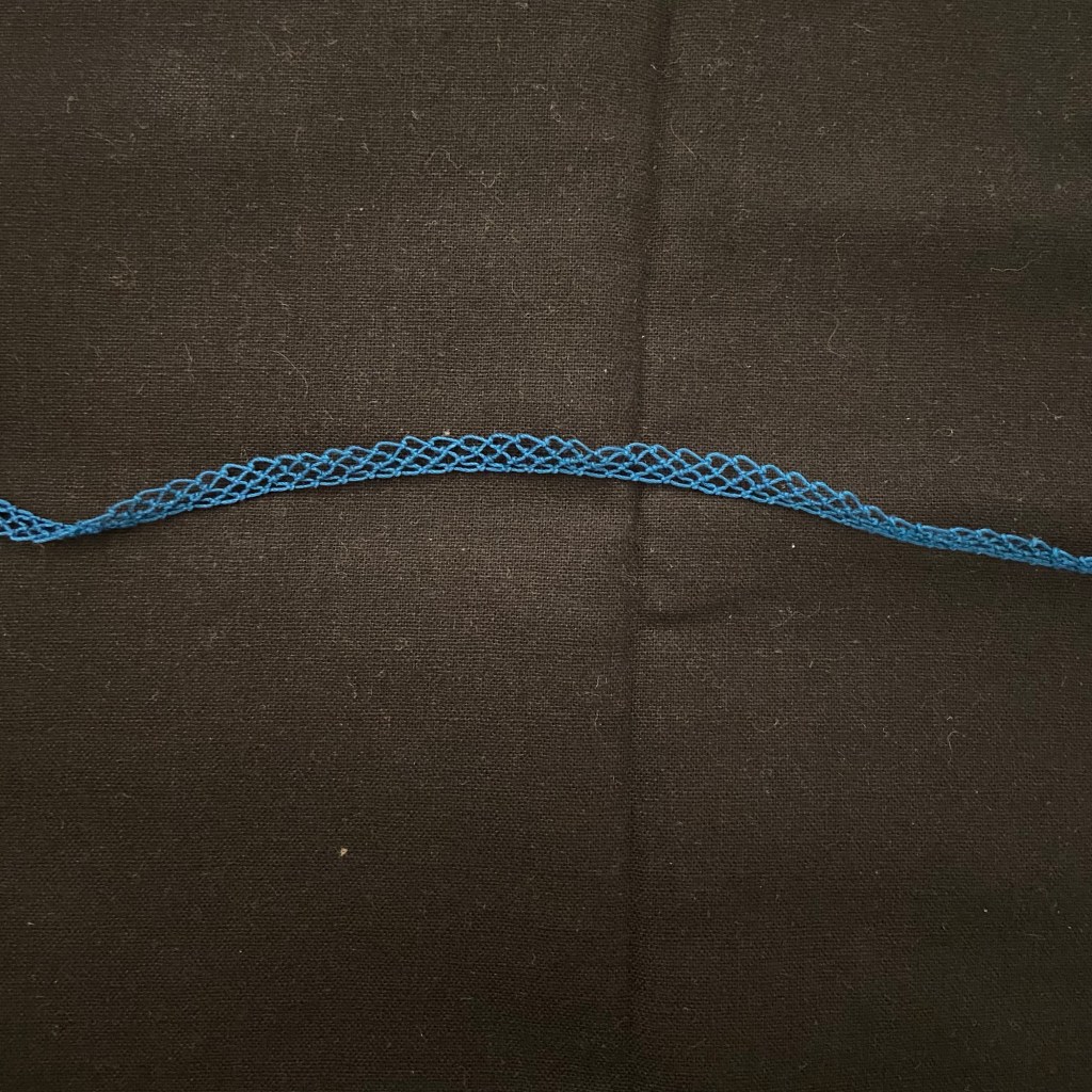 The minimum length for state fair entry is 12 inches, but I started with a much smaller proof of concept. I did each row from left to right as if it were in the round, then realized that’s not the best way to go about this.