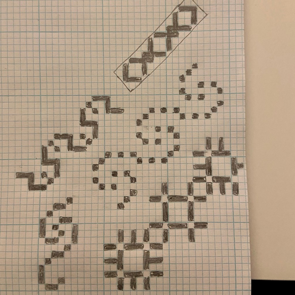 I found some other designs I had forgotten about in my pad of graph paper. These were doodles for an Aintab embroidery sampler I’ve been hypothetically planning to make for well over a year. I recently purchased cross stich charting software, so I decided to make a digital version of these charts.