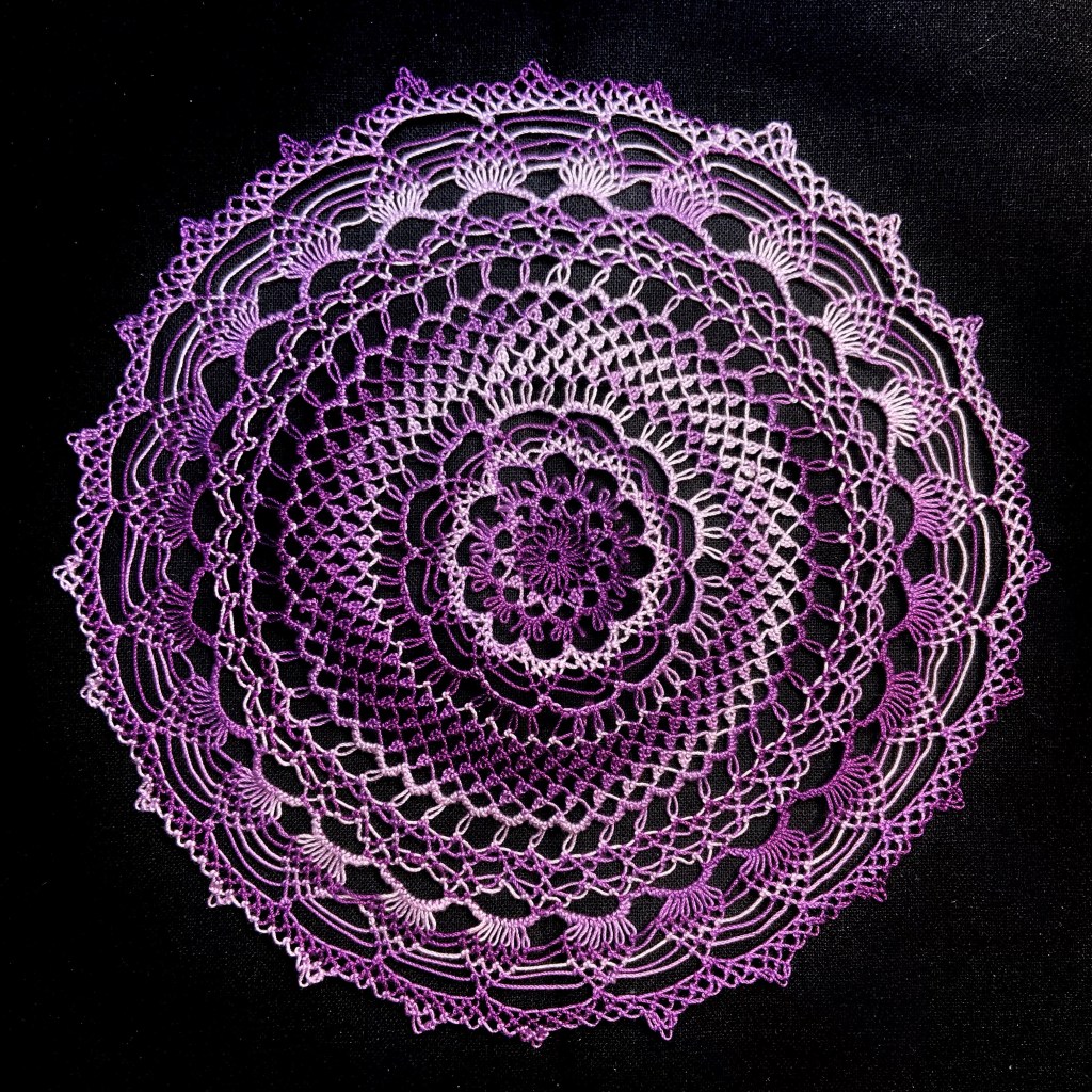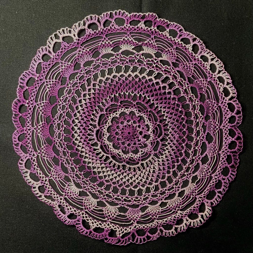 As you can see, the scallops didn’t pan out in my doily. I design most of my doilies on the fly, only planning out one band at a time and rarely sketching things out before I start stitching. My mental math failed here – I didn’t account for the outer radius of the scallops, leaving everything squished in a much too small space. Not only does this look strange, it also prevents the lace from laying perfectly flat.