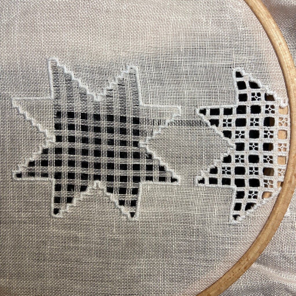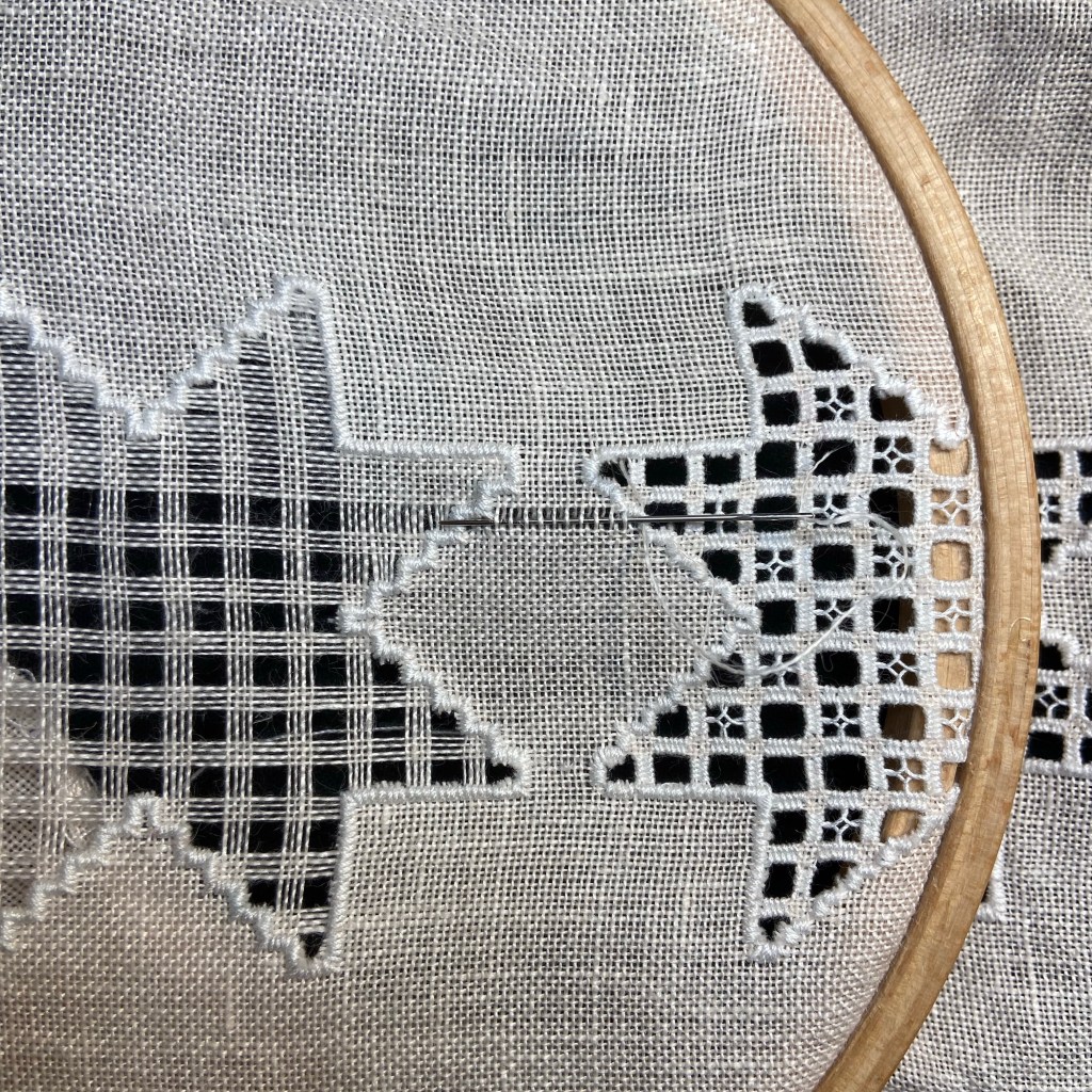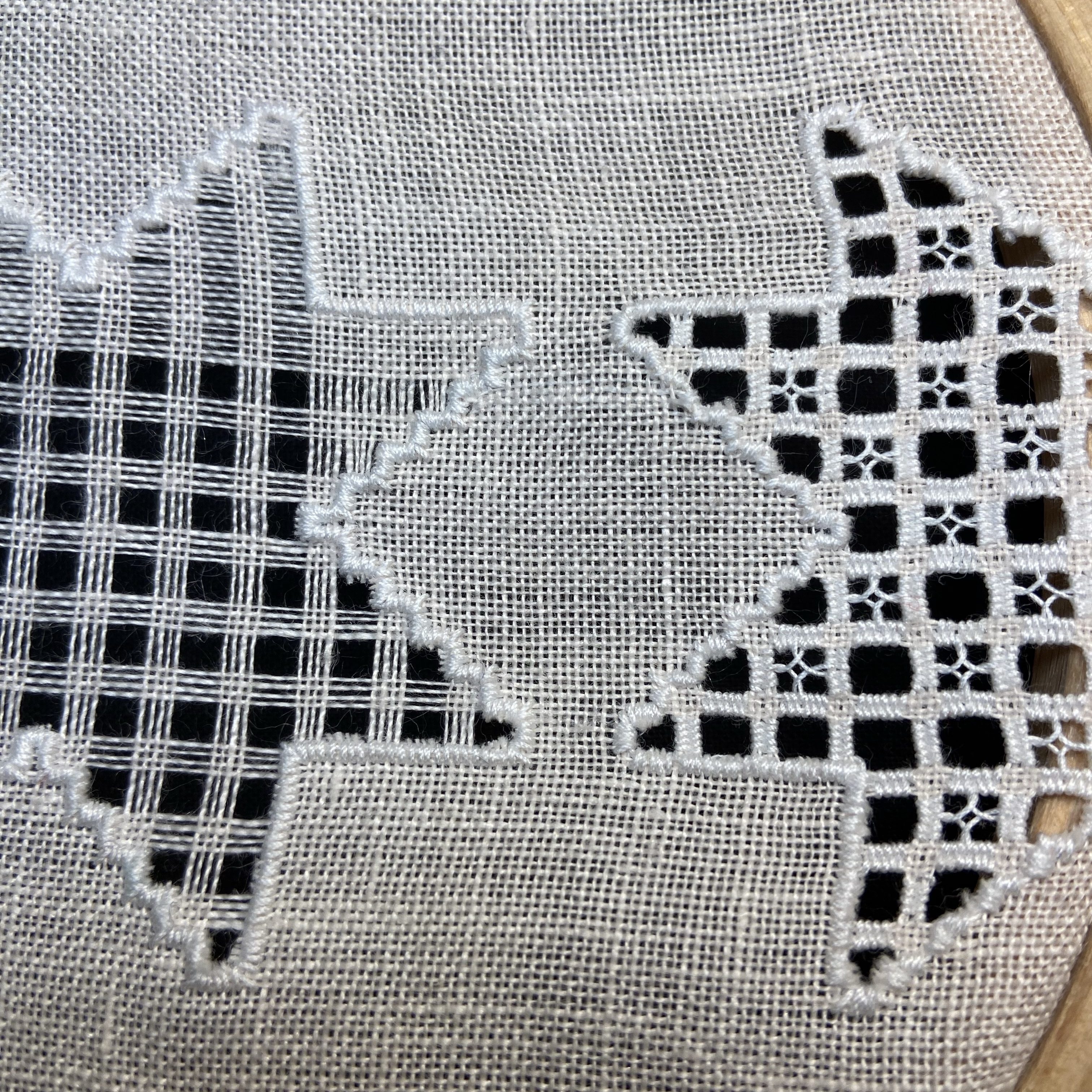 I got to work after redesigning my chart to account for the bars and remove the smaller cutwork elements. In cutwork, the advised stitching order tends to be to complete all surface/satin stitches, then cut the threads, and do the filling stitches at the end. Instead of doing this, I’m fully completing one star at a time. I use hoops instead of a frame, and moving a hoop around with unfilled cutwork feels risky.